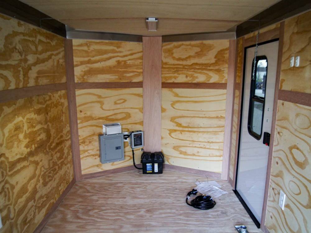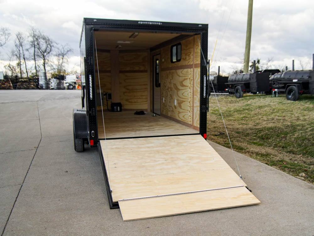 The 7-foot by 14-foot black v-nose enclosed trailer with an electrical package comes with two greaseable 3,500lb axles and a 50 AMP electrical package. This trailer has a spring-assisted loading ramp and a passenger-side window.